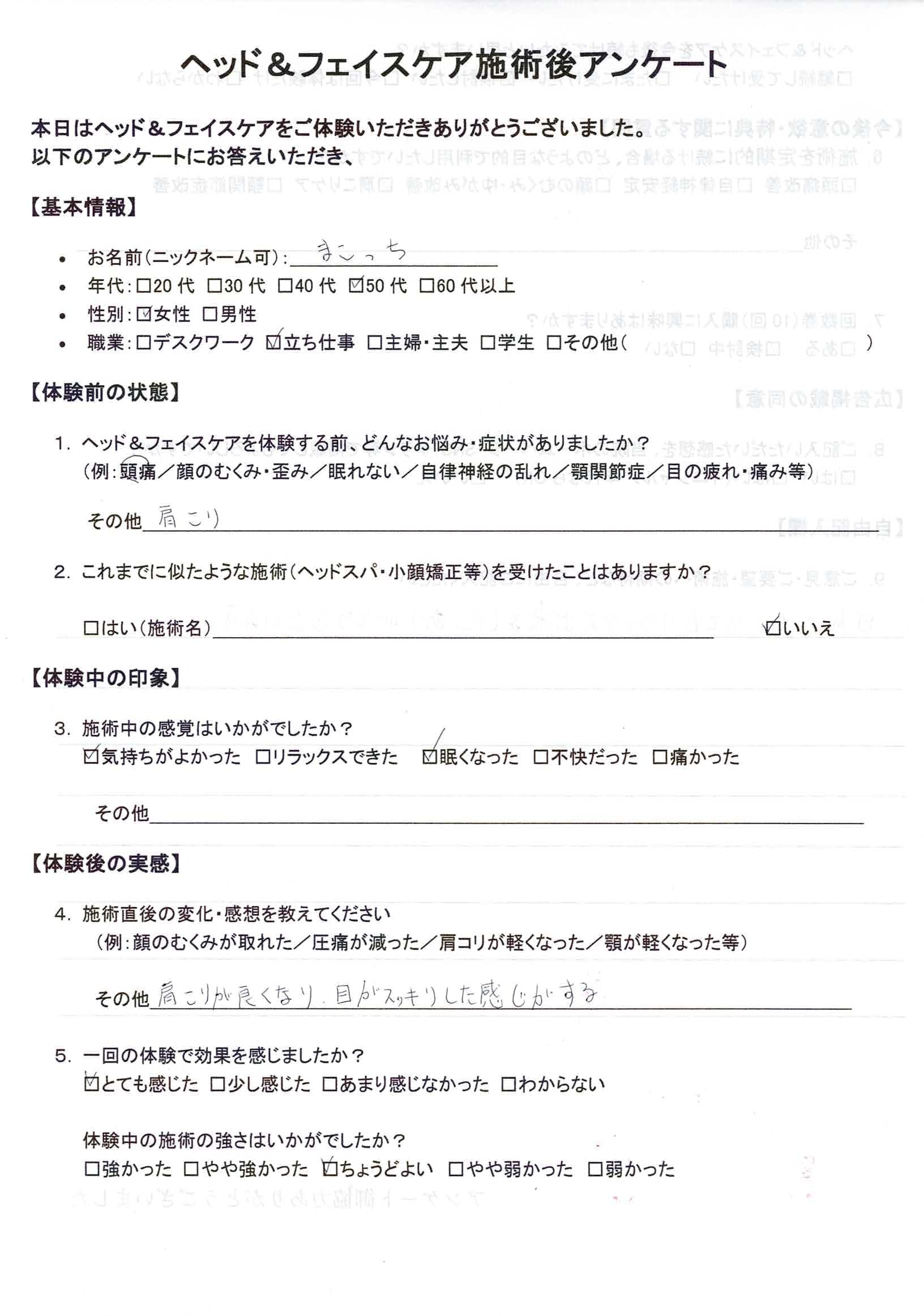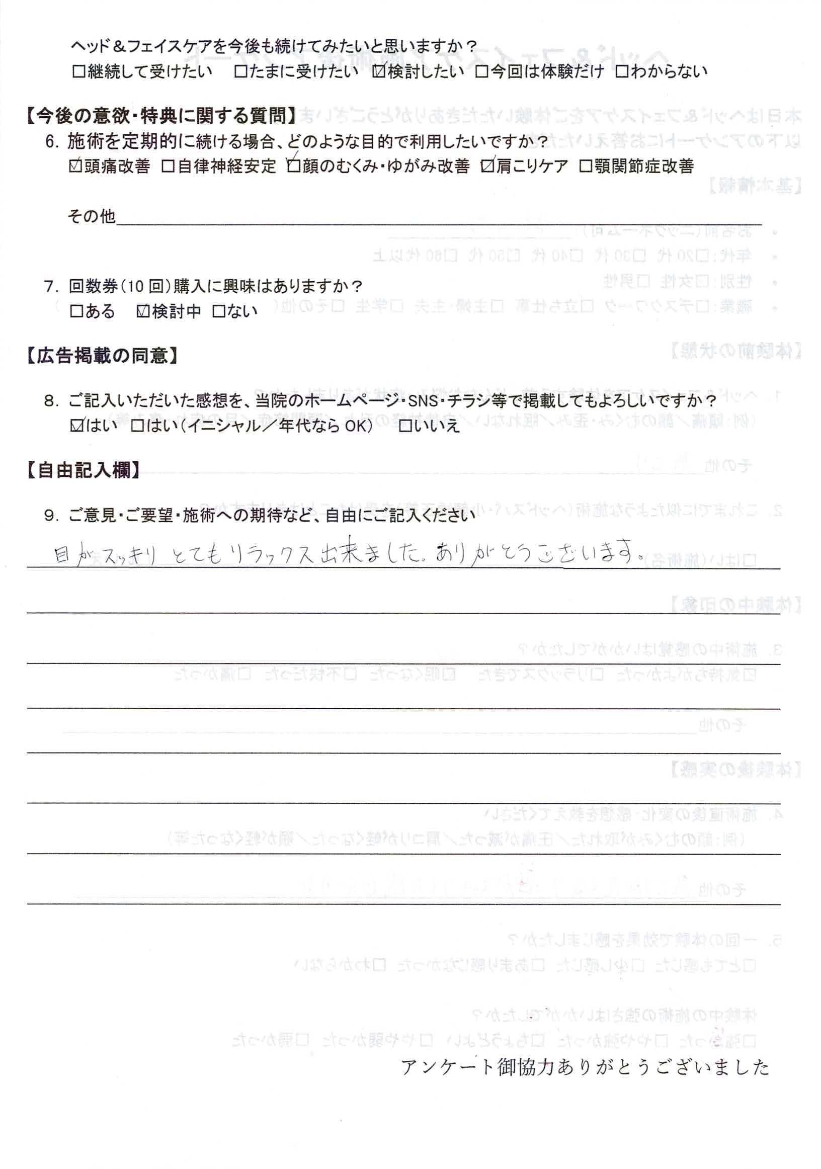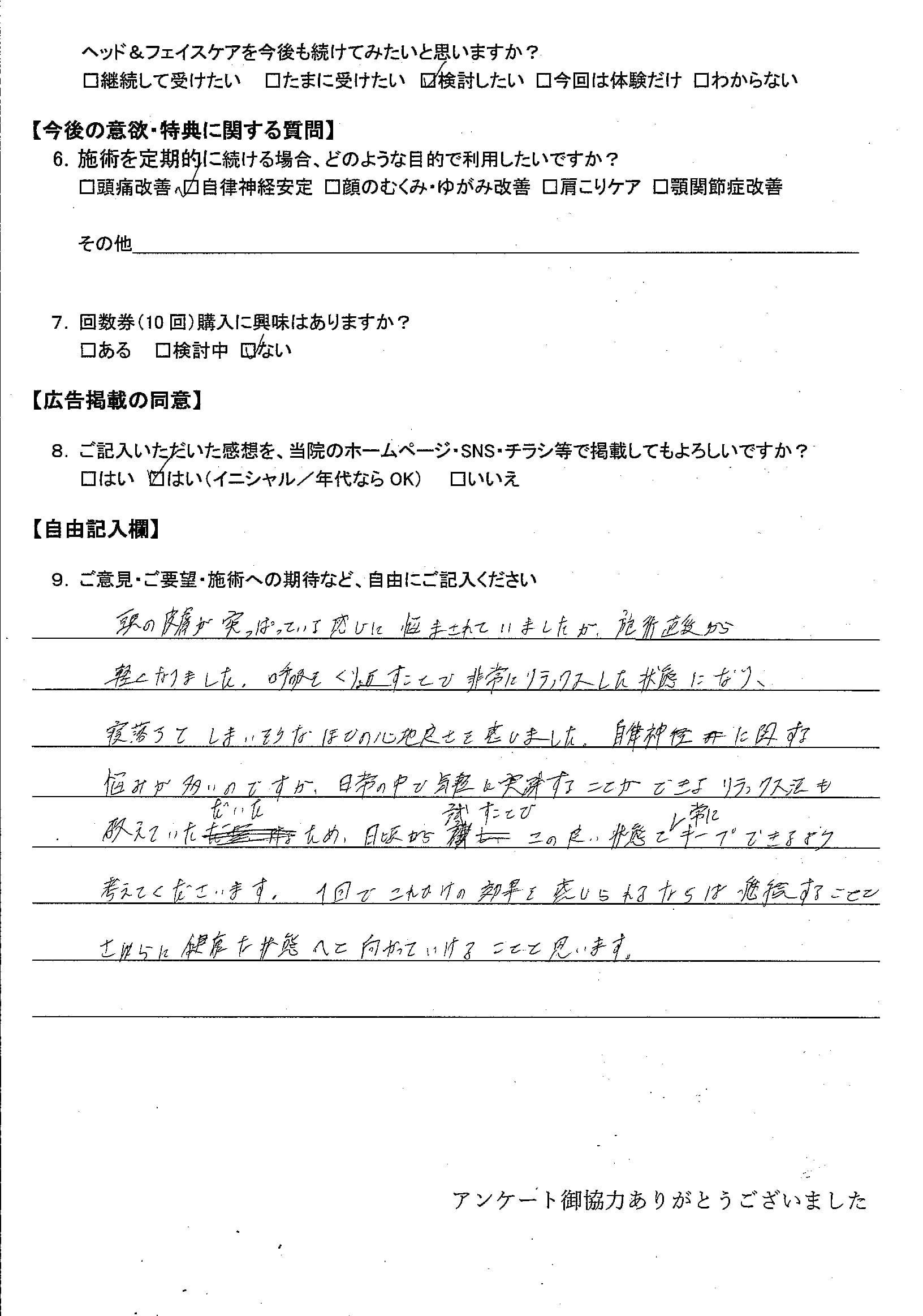 初めて施術を受けた夜、途中で一度も起きずに朝までぐっすり眠れたのが本当に嬉しかったです。